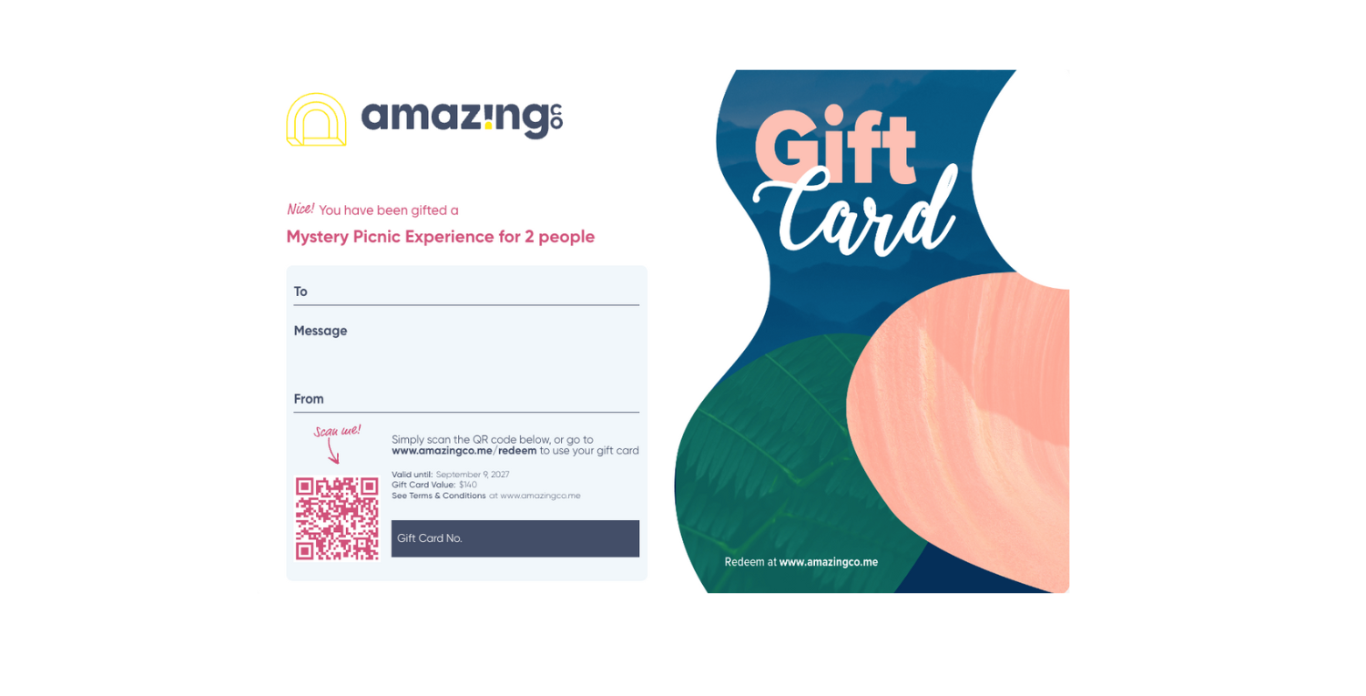 "sectionBody": "<h2>Why Experience Gift Cards Stand Out</h2><p>While store vouchers are handy, the most memorable gift cards aren’t for things; they’re for experiences. With an AmazingCo Gift Card, your loved ones can choose from unique adventures such as:</p><ul><li><a href=\"https://www.amazingco.me/aus/experiences/mystery-picnics/dates\" rel=\"noopener noreferrer\" target=\"_blank\"><strong>Mystery Picnic</strong></a><strong>:</strong> Explore beautiful locations while uncovering clues that lead to a delicious spread.</li><li><strong>Experiences at Home:</strong> Bring the fun to their kitchen with <a href=\"https://www.amazingco.me/aus/experiences/taste-and-create\" rel=\"noopener noreferrer\" target=\"_blank\">cocktail kits</a>, tasting boxes, and more.</li><li><strong>Day Trips and Tours:</strong> <a href=\"https://www.amazingco.me/aus/experiences/wine-tours\" rel=\"noopener noreferrer\" target=\"_blank\">Wine Tours</a>, <a href=\"https://www.amazingco.me/aus/experiences/farm-to-table\" rel=\"noopener noreferrer\" target=\"_blank\">Mystery Farm to Table</a>, <a href=\"https://www.amazingco.me/aus/experiences/adventure-days\" rel=\"noopener noreferrer\" target=\"_blank\">Adventure Days</a>, and <a href=\"https://www.amazingco.me/aus/experiences/mystery-bar-hop\" rel=\"noopener noreferrer\" target=\"_blank\">Mystery Bar Hops</a> are waiting to be discovered.</li></ul><p><br></p><p><strong>Pro Tip</strong>: If your loved one is far away and printing isn’t an option, schedule an AmazingCo gift card to be sent directly to their inbox on a chosen date.</p>"